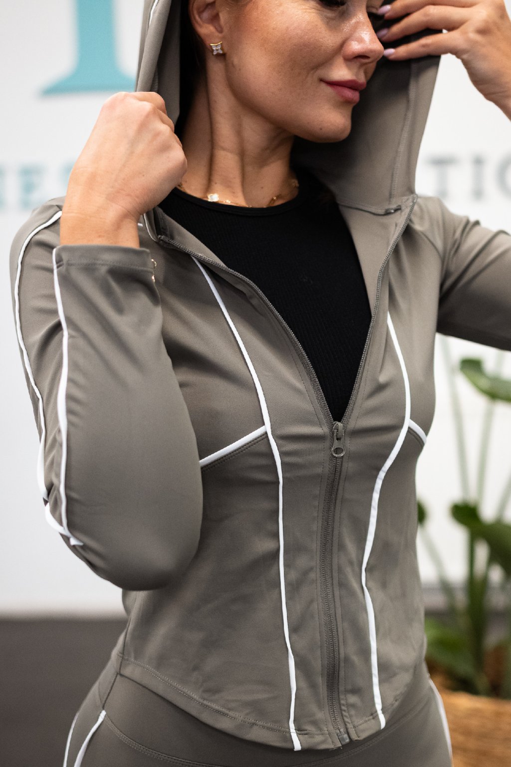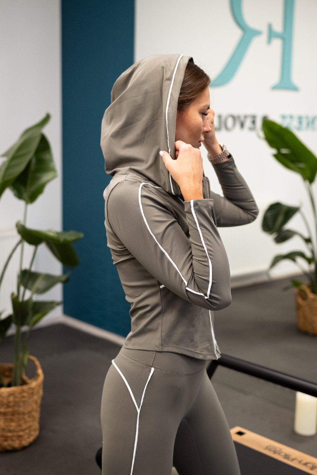 Štýlový tréningový set so zipsom, s dlhým rukávom a normálnou dĺžkou, pohodlne kopíruje línie tela. Materiál je priedušný, ľahký a elastický, ideálny na tréning, pilates, jogu alebo bežné športové nosenie.