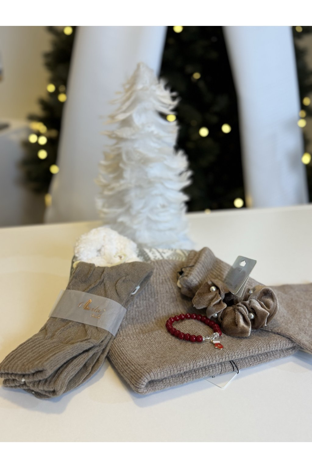 Obsah setu: čiapka, rukavice, gumička do vlasov, náramok a papuče – štýlové a teplé doplnky v jednom balíčku.