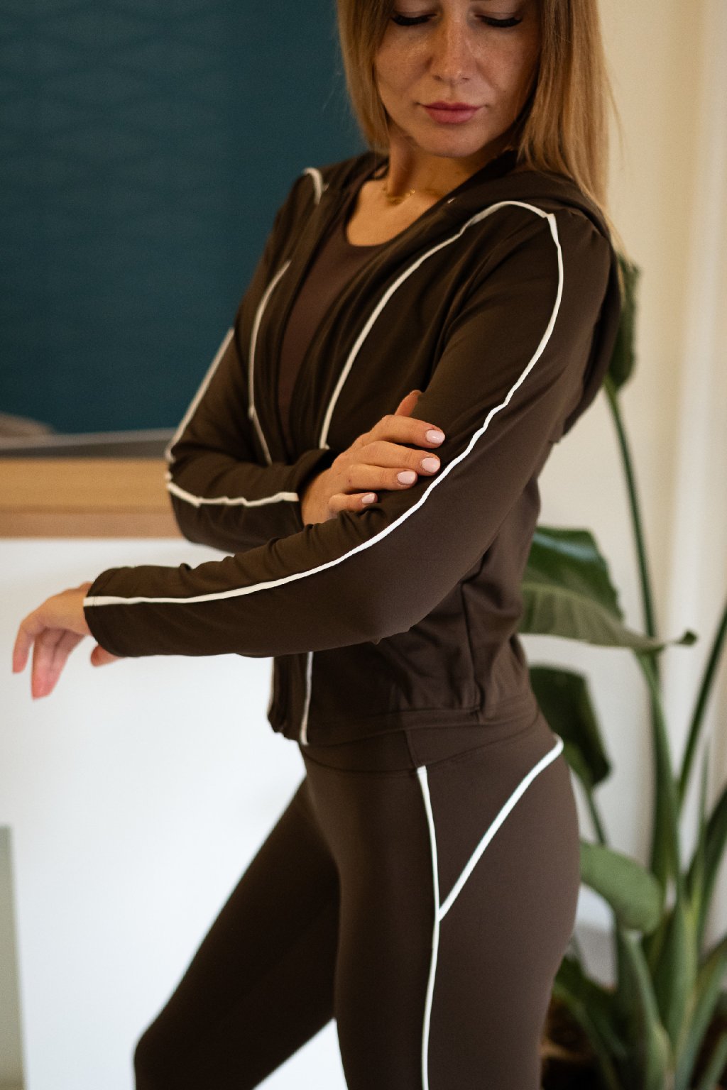 Štýlový tréningový set so zipsom, s dlhým rukávom a normálnou dĺžkou, pohodlne kopíruje línie tela. Materiál je priedušný, ľahký a elastický, ideálny na tréning, pilates, jogu alebo bežné športové nosenie.